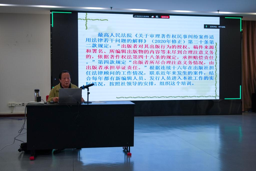 为全面提升员工的法律素养,增强经营风险防范能力,11月11日下午,我社特邀法律顾问王滋楚律师,采用线上线下相结合的方式,面向全体编辑及营销人员举办了一场法律知识专题培训。